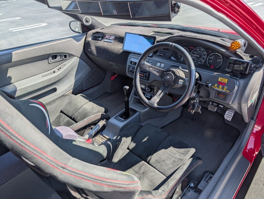 ほぼノーマルのシルエットを維持しつつ灯火類はUS仕様に変更し、無限MR5ホイールをリバレルし、2ピースの6.5Jのリム幅から3ピースの7.5Jに加工。初代シビックRSの純正鉄チンホイールをイメージして加工したホイールセンターキャップを装着、無限ストライプも追加済み。