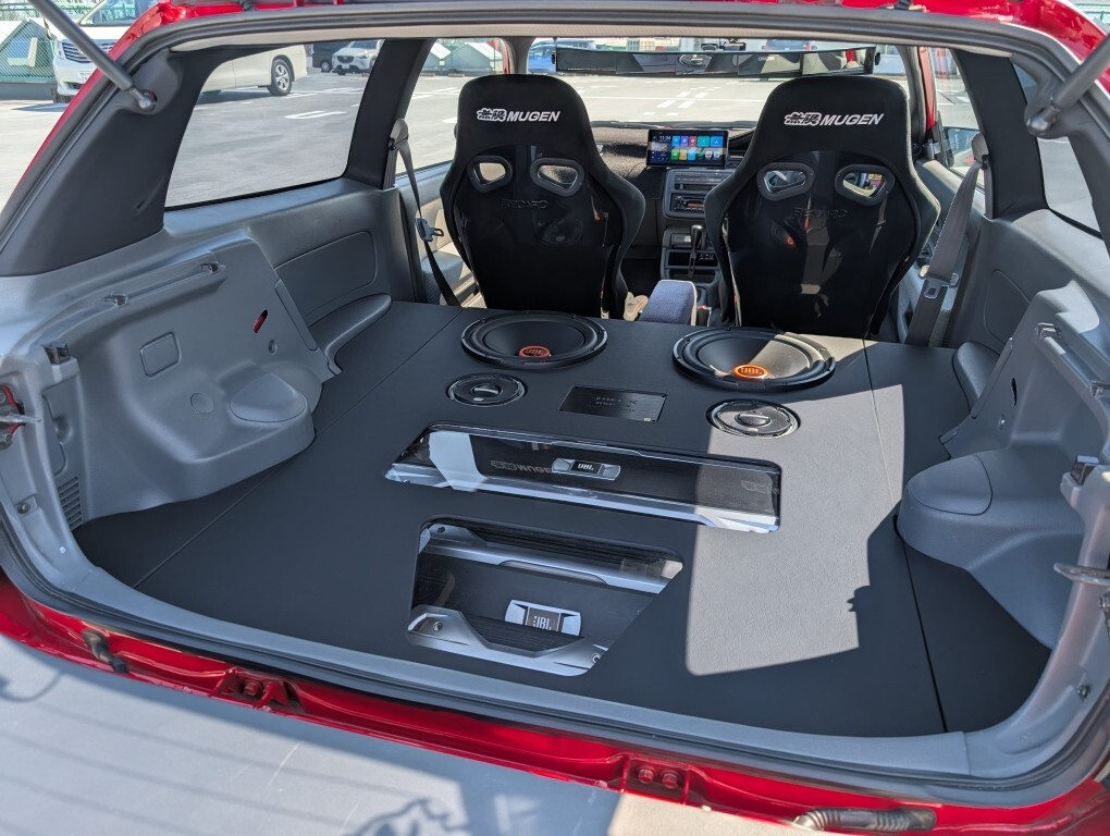 後席は撤去し、JBL製のアンプやサブウーファーなどを搭載したトランクオーディオ仕様。